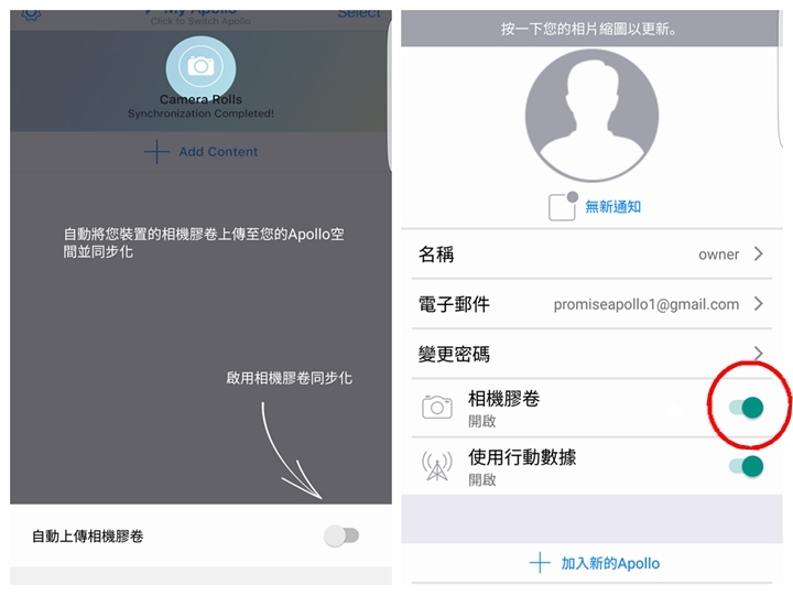 ▼針對手機和平版行動裝置,只要一個開關選項,你就可以快速將裡面所拍的照片快速同步上傳到你的Apollo Cloud,相當的方便跟簡單。