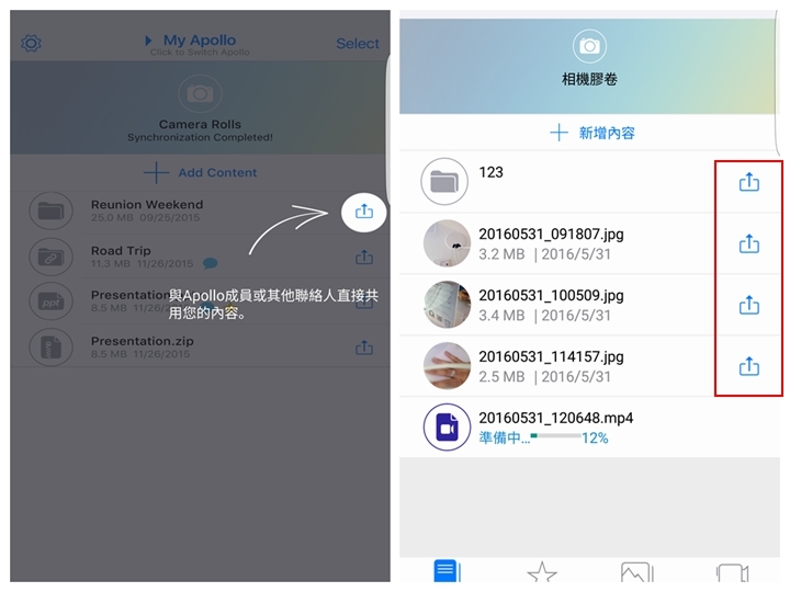 ▼一但打開"相機膠卷"的功能,就會自動把手機和平板裡面相機所拍的照片,同步上傳到Apollo Cloud。