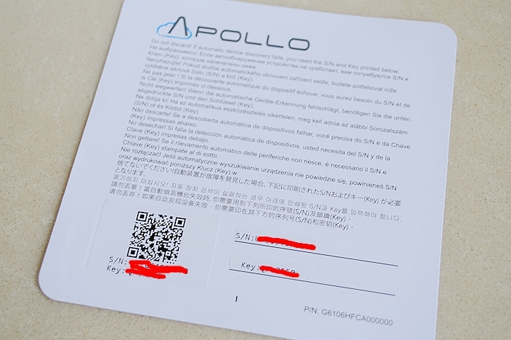 ▼這張可說是Apollo Cloud的身分證了,上面記載Apollo Cloud的序號,可是獨一無二的,再接下來的安裝過程,"有機會"需要用到,所以要保存好。