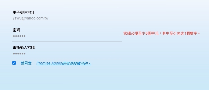 ▼在設定帳號時要注意到,密碼長度需要6碼以上,且要英數混合才行喔!