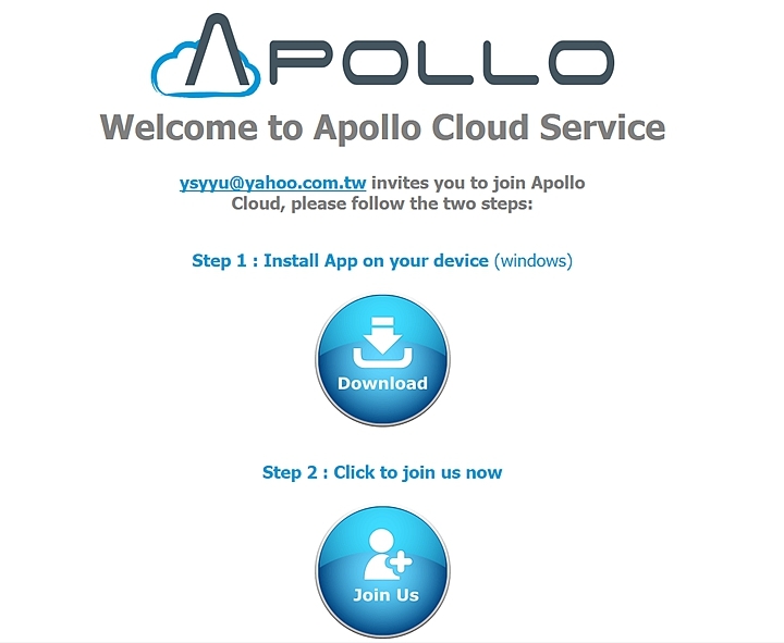 ▼當對方收到你的邀請連結後,貼上瀏覽器,將會連結到以下的畫面,第一步會提示先安裝Apollo Cloud的用戶端軟體,這個部分就跟之前安裝的軟體是一樣的。接下來第二步,點選join us,來啟動加入Apollo Cloud的步驟。