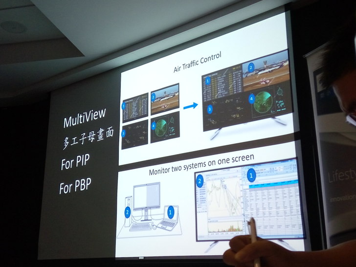 現在很多調查都發現,3C使用者無法滿足於一個螢幕上的內容,就像以前製圖的高手電腦或是股票分析師,再者或是像我們這樣一般的小資族,回到家先按下電腦開關,再打開電視,外加隨時留意手機上的畫面,恨不得再生出幾雙手幾雙眼睛來分工合作,此時「多功子母畫面」就能實現讓所有想要的畫面都出現在同一個框框內;尤其現在生活空間壓迫,為了要配合擺設造成空間更壓縮,這樣的結果很容易使得坐姿變得怪異,或是脖子需要更多的轉動空間,有了「多功子母畫面」的功能就可以快速改善這個現代常見的空間問題。更重的一點是,可避免錯過重要的畫面,因為它建了MHL可以把不離身的手機畫面快速代入,既可整合又能不錯過。