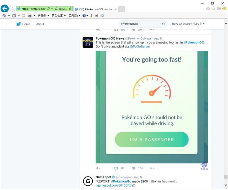 (1)當移動速度太快,被 app 判斷為搭乘交通工具時,畫面上將彈出提醒訊息與對話框,玩家必須表明自己是 Passenger (乘客) 才能繼續進行遊戲。(註: 訓練師騎車或開車,法令禁止一邊駕駛一邊滑手機,開罰事件不勝枚舉)