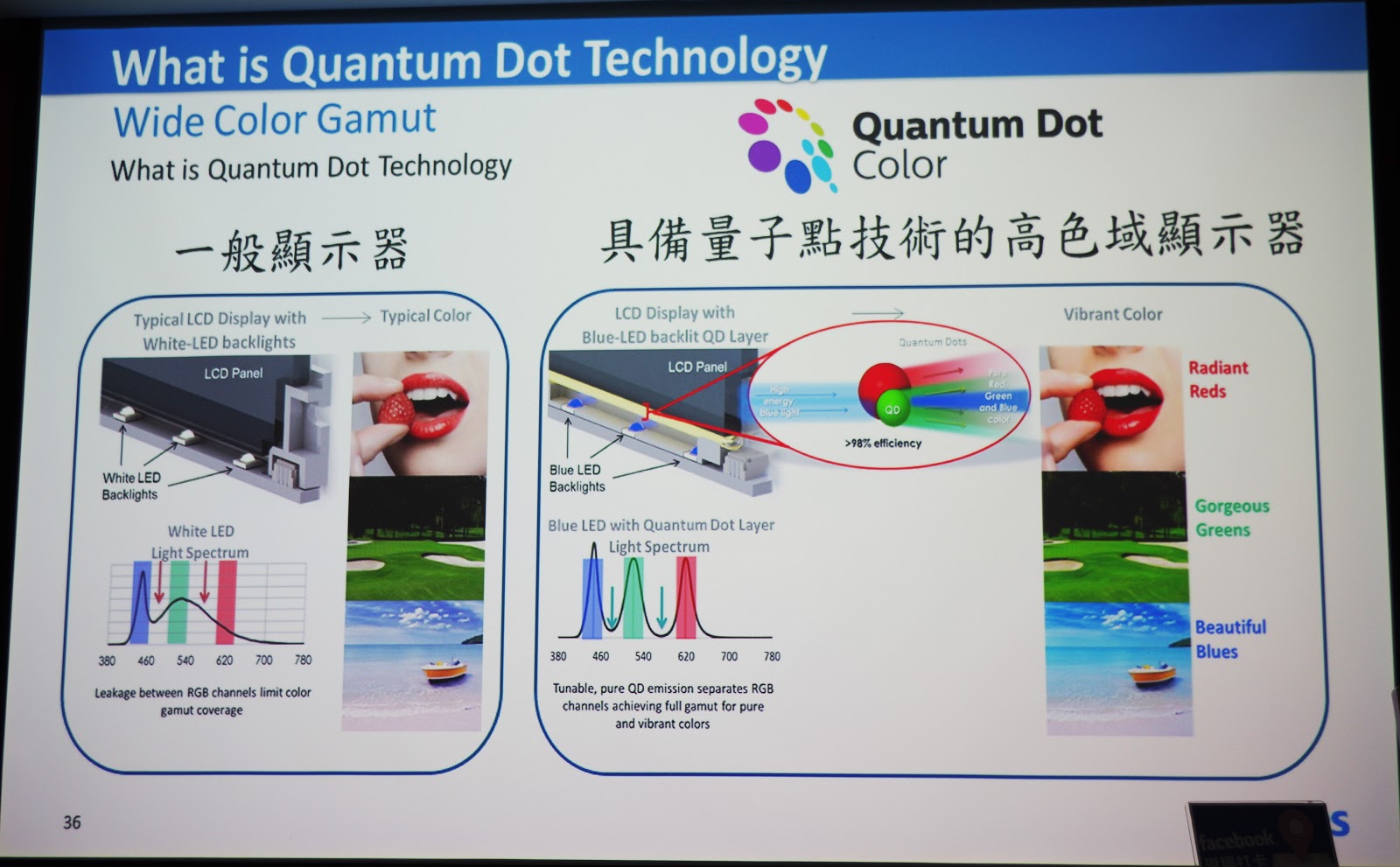 A2. 有量子點 Quantum Dot 技術,所以顏色表現精準和飽和,顏色表現和現場肉眼看到一樣,且色彩顏色可以涵蓋到 99% Adobe RGB 色彩空間和 100% sRGB 色彩空間。