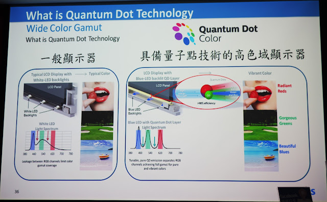 ▼ 量子點顯示技術,可以讓顯示器的 RGB(紅綠藍) 三色平均輸出,而不會像傳統的 LCD 顯示器,會有藍色強,紅色弱的問題,也是因為這樣的技術,所以可以使顏色更精準,色彩表現更飽和和艷麗 。