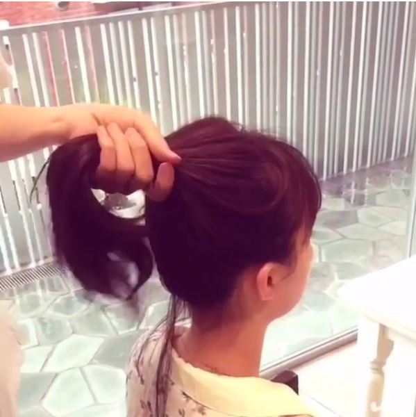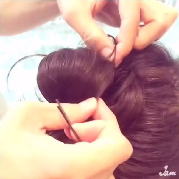 將接近後腦勺的包包頭的頭髮夾在頭上固定(將丸子的型狀塑造出來~固定也比較不容易散落)