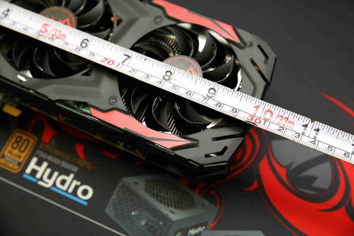 POWERCOLOR RED DEVIL RX480 8GB因為採用了3個80mm的風扇來做冷卻散熱器統,也因為這樣子整張顯示卡的長度來到了30公分左右,看起來也較為瘦長,各端子與金手指也都有上保護套,可避免未上機時氧化,另外紅魔RX480並無任何燈光特效的效果。