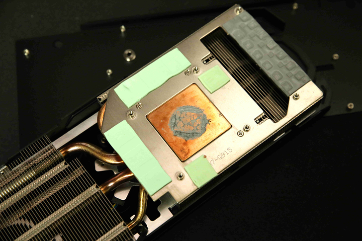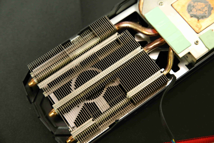 由於看到顯示卡上無防拆小貼紙,於是就拆起來研究研究一下,可以發現到散熱器比PCB版還要來的長許多,約有六公分的差距,散熱器是由四根熱導管將銅底接觸面的核心熱能帶到各鰭片上來讓3個80mm的風扇來加速排除,核心旁邊的供電元件以及記憶體顆粒也經由散熱貼片傳導到散熱器金屬板上來散熱。