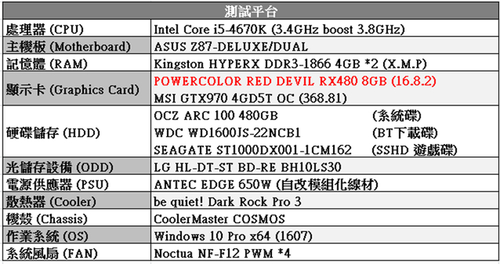本次的測試也順便將電腦重灌一下,作業系統已更新至Windows 10 1607,兩陣營的驅動程式也為最新版的16.8.2與368.81,配備如下表: