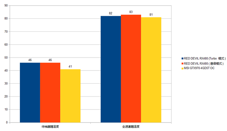 紅魔RX480 兩種模式下的待機溫度都是一樣的,MSI GTX970 鎧甲虎則是相對低溫,使用MSI Kombustor v3.5.2.1 中的 Furry Donut 來進行燒機測試,可以發現到標配三風扇的紅魔RX480抑制溫度的能力並無想像中來的理想,極有可能是AMD核心製程問題,反而是風扇較入門的GTX970 鎧甲虎表現還比較好一些,甚至有些GTX970型號還有加入停轉功能,此評比則是由NVIDIA的製程工藝勝出!