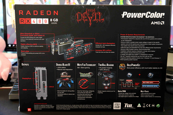 除了第一眼看到包裝給的視覺感受外,包裝正面上還有標示出RX480所支援的技術,例如DX12 / AMD Freesync / VR…等等,包裝背面則是將RED DEVIL的端子配置與性能、散熱技術做個說明,後面也將有相關的實測供各位參考。
