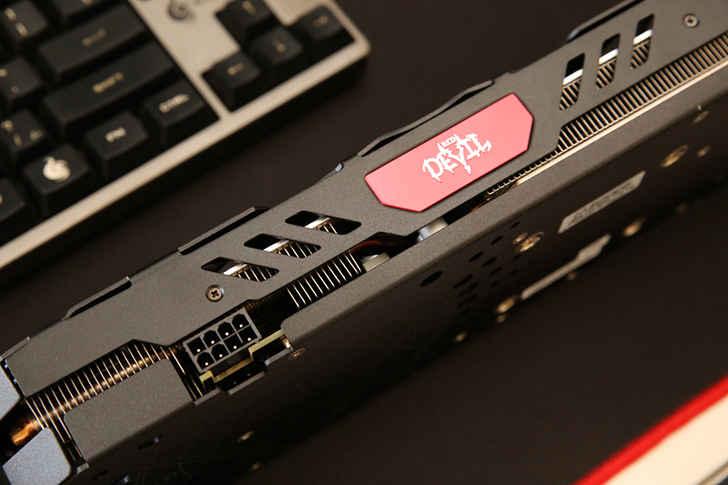 風罩上有著RED DEVIL的紅底白字銘牌,而在左手邊則是電源輸入的接口,需要的一組PCI-E 8pin的電源輸入,才能來讓紅魔 RX480 甦醒,這邊建議的瓦數至少500以上較妥當。