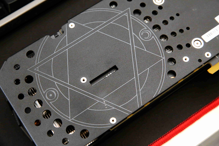 目前市場上旗艦級商品都會安置強化背板,避免卡過長又長時間使用導致顯示卡彎版,當然紅魔 RX480 也標配了,更在強化背板上繪製個六芒星的圖騰。