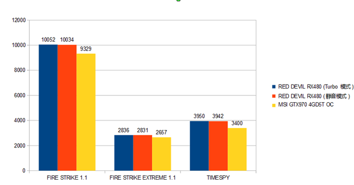 在3DMARK的部分有將紅魔 RX480 8GB 兩種BIOS設定來切換測試,TURBO模式與靜音模式所測得出來的數據差異並無很大,而在各項成績中均勝過GTX970 4GB。