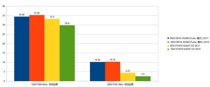 在紅魔RX480 8GB的部分,測得的結果是DX12優於DX11;而GTX970 4GB的部分則是DX11較DX12的表現好;整體表現來比較不論在1920*1080、3840*2160、DX11或是DX12下,紅魔RX480 8GB也都贏過上一世代的GTX970 4GB。