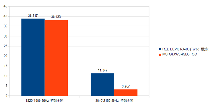 在1920*1080的解析度下,RX480 8GB與GTX970 4GB可以沒有太大的差距,但在3840*2160的解析度下,紅魔RX480挾著8GB VRAM的優勢在4K環境下大勝GTX970 4GB。