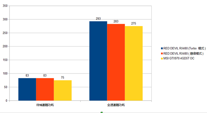 顯示卡的溫度與功耗絕大部分都是成正比,在此項目依舊是NVIDIA的強項,這邊使用的是變電家來進行監測,不論在待機功耗控制,還是全速運轉時的功耗都比紅魔RX480的兩種模式還要來的低一些。