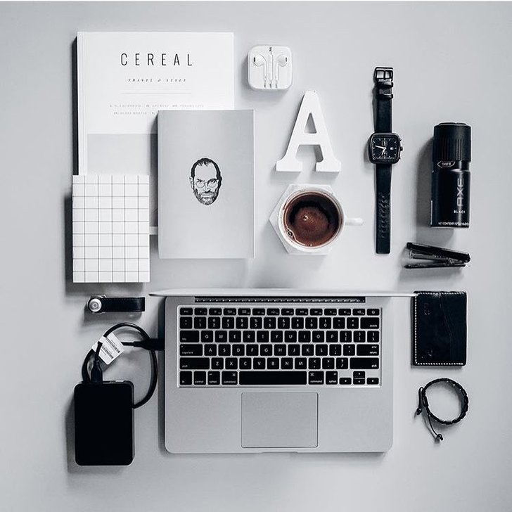 例如想拍攝筆記型電腦,但照片裡只有筆記型電腦的話似乎有點無聊,那麼旁邊放上相似類型的辦公桌物品吧!手錶、手機、行動電源都是很不錯的配角,利用高處往下拍所有物品的技巧,讓每件物品的鏡頭份量看起來都差不多。