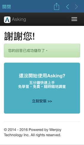 我看了一下,雖然Asking有提供很多傳問卷的方式,但如果是餐廳的話,應該還是用QRcode給客人掃描最方便,傳給朋友的話才選Line或WhatsApp之類的