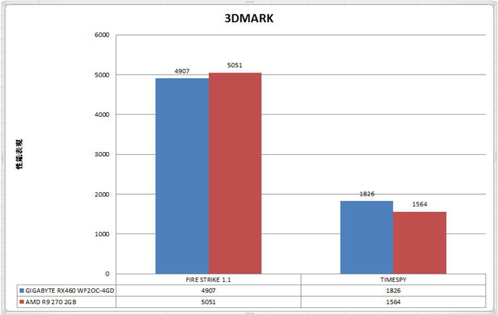 本次在3DMARK中,RX460與R9 270各有勝負,DX11下R9 270小勝RX460,在DX12下則是由RX460勝出,效能上並無有明顯的差距。