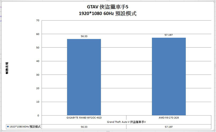 以這兩張卡來做1920*1080的解析度下特效全開實在有點虐,所以這邊的測試稍微做個改變,解析度維持1920*1080 60Hz,特效全部都使用”預設值”,並將垂直同步給關閉,測得的結果R9 270一樣是略勝RX460一咪咪,但今天特效的VRAM吃越多,RX460則會追回來。