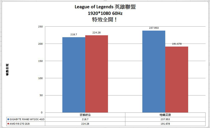 雖然說測這個有點殺豬用牛刀,但目前許多人組電腦還是會問跑的順不順,這邊就測試一下最常玩的兩張地圖:召喚峽谷與咆嘯深淵,基本上開垂直同步都是可以穩跑60幀,關掉垂直同步後,性能表現是由R9 270勝出些,但由於網遊可能受到玩家技術與網路連線品質影響,所以可能會有出現右邊圖表的現象。