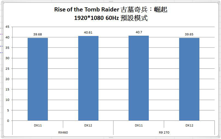 在今年年初才搬到PC平台上的”古墓奇兵:崛起”,同時支援了DX11與DX12,因此拿來測試便能知道遊戲性能到底差異在哪,但由於RX460與R9 270兩張來跑特效全開,意義可能不太大,因此也與GTAV一樣固定1920*1080 60Hz的解析度,特效以預設值來進行DX11與DX12下的測試。