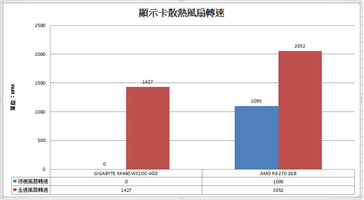 你可能會覺得「天阿!在全速運轉下,新製程應該要散熱好一點吧?」,我們來觀察一下轉速大概就可以了解到在待機下,RX460WF2OC-4GB的有支援停轉功能,溫度能控制在37度算是相當了不起,而在全速運轉下的溫度雖然高達80度,但風扇轉速RX460WF2OC-4GB還不到1500轉,假設轉速提高到跟R9 270一樣,溫度是可以控制在63度,這部分RX460WF2OC-4GB的BIOS可能可以再設定聰明一些會更好。