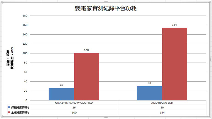 這邊由於是有220V的電壓搭配FSP 全漢黑爵士X 450來進行功耗的紀錄,在待機狀態下RX460僅有26w,最大的功耗也只落在100w整,對比R9 270可以說非常省電,將近有50%的差距,所以一般套裝電腦也是可以輕鬆直上做升級。