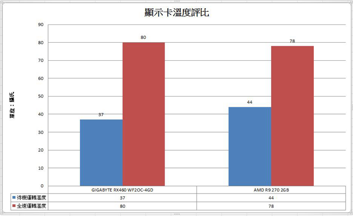 溫度的部分是在室溫32度下,裸機平放測試,並無撞風,RX460WF2OC-4GB在待機的下的溫度為37度,而R9 270 2GB則是在44度,使用FURMARK 1.18.0下去燒個10分鐘後,RX460WF2OC-4GB溫度落在80度,而R9 270 2GB則是在78度。