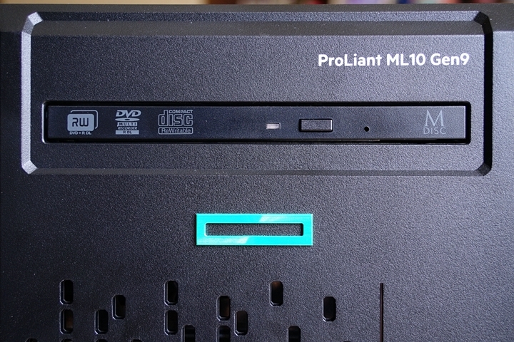 ▼HPE ProLiant ML10 Gen9伺服器,正面上方清楚標示產品名稱,且上方有配置一個DVD燒錄機,比較特別是,它並非採用一般常規大小的DVD燒錄機尺寸,而是採用給筆電用的光碟機。而四方形綠色鏤空LOGO標識,純粹就是LOGO貼紙標示一枚,非LED燈也無其他功能。