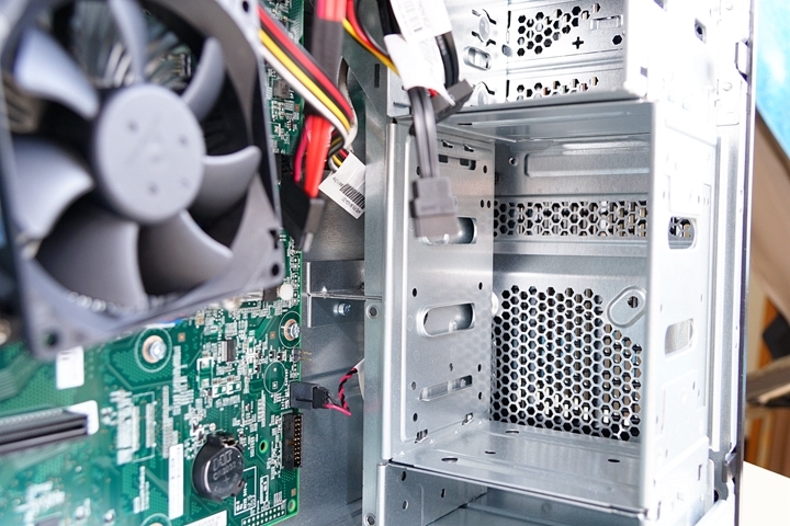 ▼HPE ProLiant ML10 Gen9在機身內部所提供的硬碟擴充空間,總共最多可以安裝6顆LFF尺寸(3.5”)硬碟。