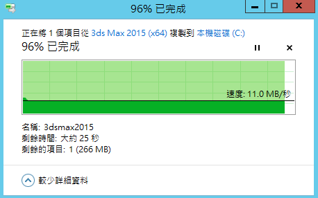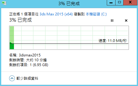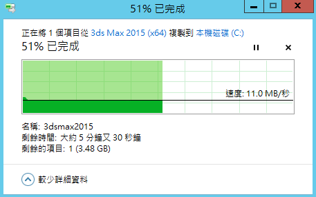 ▼在檔案伺服器測試中,筆者簡單在HPE ProLiant ML10 Gen9伺服器上建立有一個可以透過網路芳鄰存取的網路資料夾,測試用資料則是1個7.78 GB的ISO單一大檔,可以看到資料的傳輸率很穩定維持在每秒11MB。