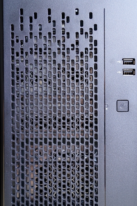 ▼大面積前方面板的鏤空設計,可以提供伺服器有最好的散熱性,不規則孔洞大小也更有設計美感。另外在正面右側也可以見到主電源開關和兩個前置USB 2.0接孔。
