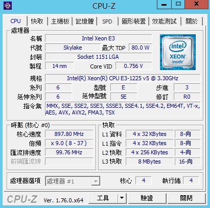 ▼透過CPU-Z這套工具,可以快速檢視HPE ProLiant ML10 Gen9伺服器的硬體規格。從CPU一欄,就可以清楚知道HPE ProLiant ML10 Gen9伺服器所採用的是INTEL4核心的Xeon E3-1225 3.30GHZ。