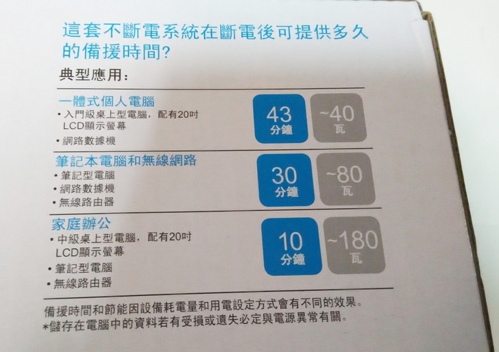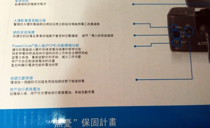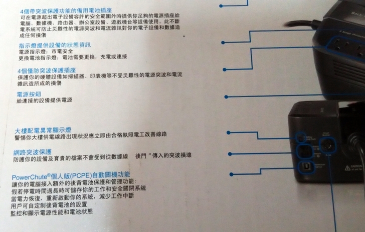 上面黃色貼紙要撕掉後才有"備用電池+突波保護"可用,然後就把電腦插頭插上UPS上再把USB資料線連結設備,接下來到官方去下載PowerChute 電源監控軟體,然後再依需求設定電源監控軟體內的設定這樣就完成了。