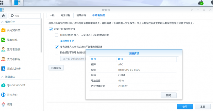 個人是要給NAS用的所以不用去下載PowerChute,NAS的話就看廠牌有沒有支援,本人是用Synology的NAS下面附上連接後截圖內容。
