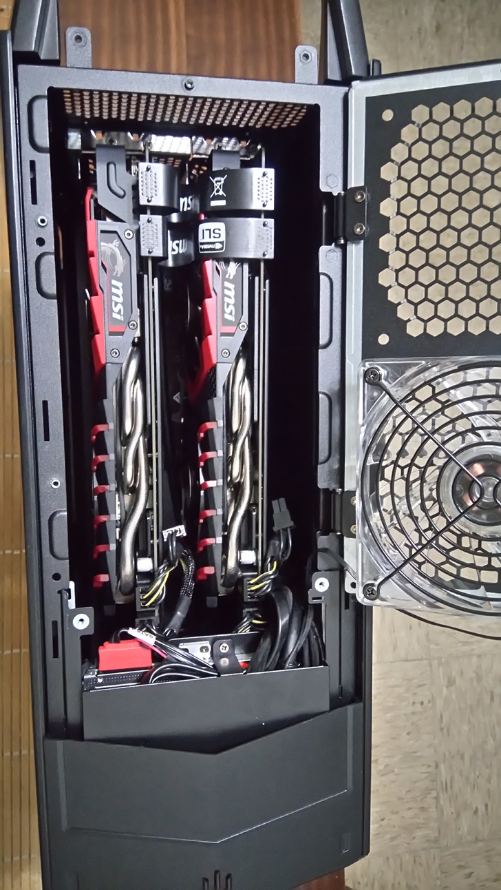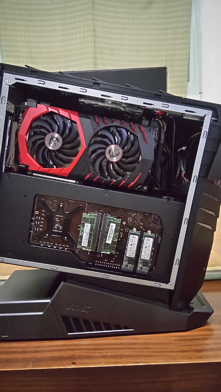這一次AegisTi的設計可真的是說是佛心來著,讓顯示卡是直立式,而不再是以往的橫接式,這樣的設計不僅可以防止接頭斷裂,也能讓顯示卡容易更換,升級更容易,你說,這是不是佛心設計呀!不管你信不信,反正我是信了XD