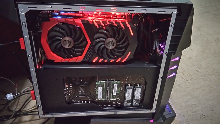 不僅在顯卡空間設計上下功夫,就像前面我們所看到的規格一樣,AegisTi這次把硬碟移出主機外騰出空間,並且把顯示卡插槽設計成直立接頭式防止接頭可能斷裂,同時為了節省主機內空間,也使用Pcie系列的SSD,使得主機空間內的線材能減少更多,再也不會因為惱人的線材而爆炸了!