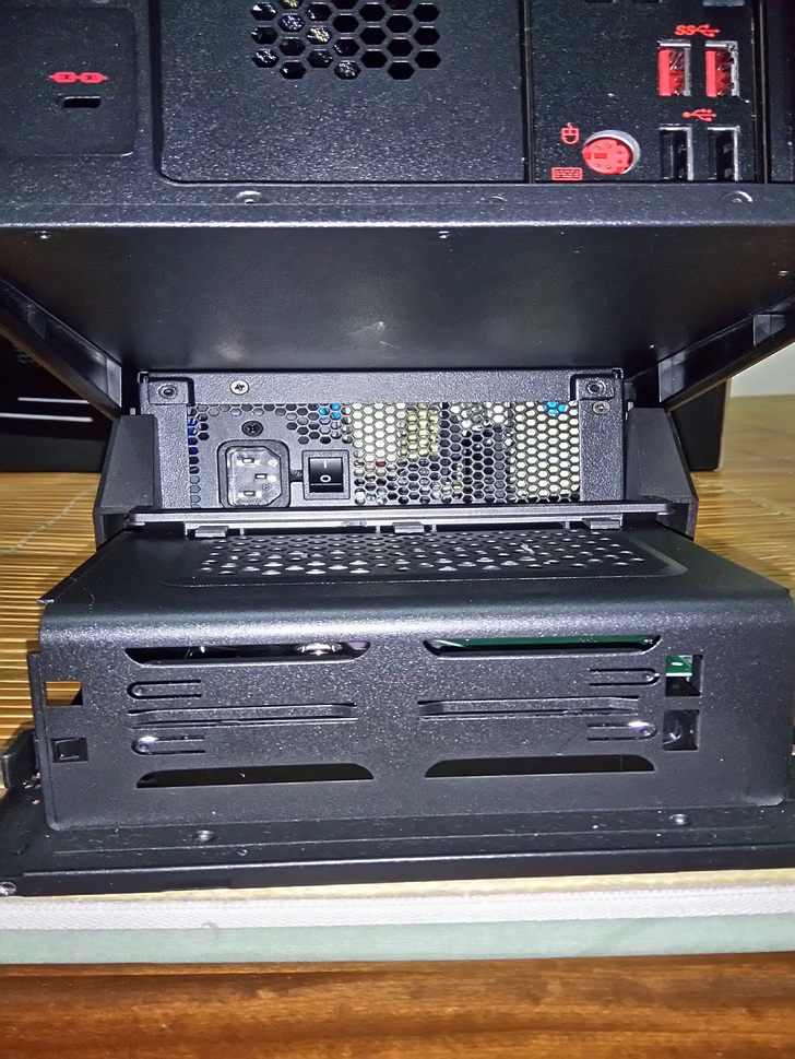 而AegisTi的電源設計也別於一般主機殼的設計,以往我們的認知是,我們的主機裡面包含一堆線材繞來繞去,而主機電源不是在最上面就是在最下面,但AegisTi的電源設計,則是把電源擺在大硬碟之前。