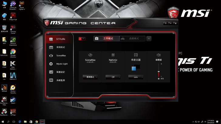 而兩個設定也比較不同,工作模式會比較偏向於灰暗寧靜色系,而遊戲模式色調會比較趨近於原色,配合AegisTi搭載的顯示卡,讓畫面看起來更真實!
