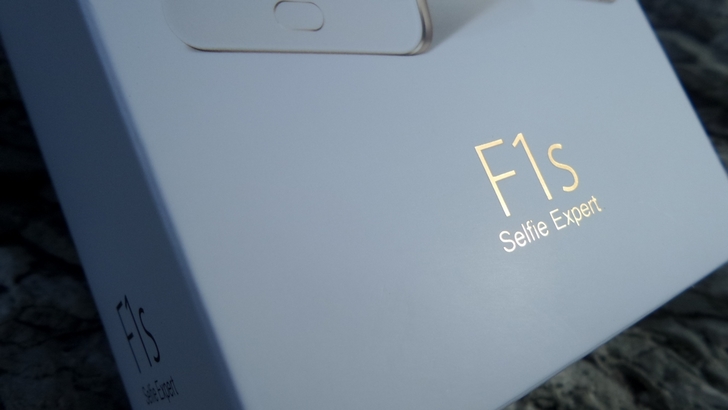 【▼】在包裝彩盒正面的F1s Selfie Expert字體發出耀眼的的金色光芒,讓人一眼就清楚這是一款自拍為主的手機。