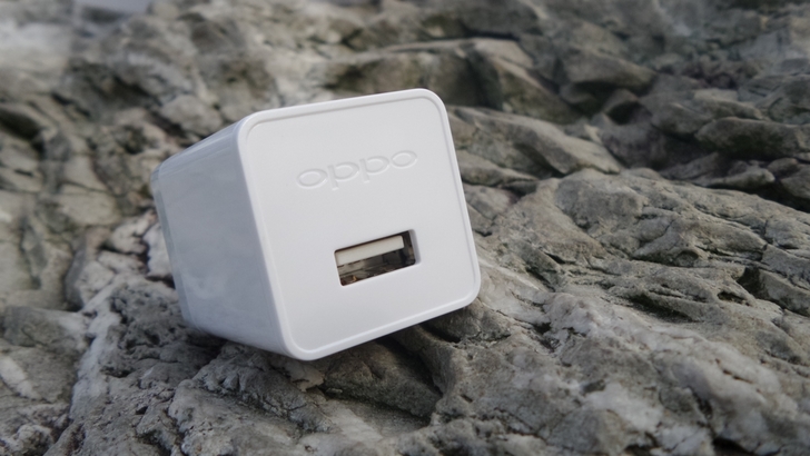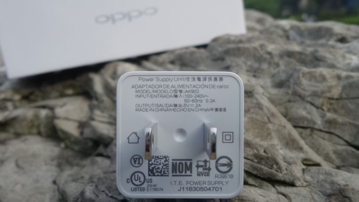 【▼】再來是俗稱豆腐人的充電器,F1s由於沒有支援自家VOOC快充,所以USB插槽為白色的,有支援自家快充則為綠色的。