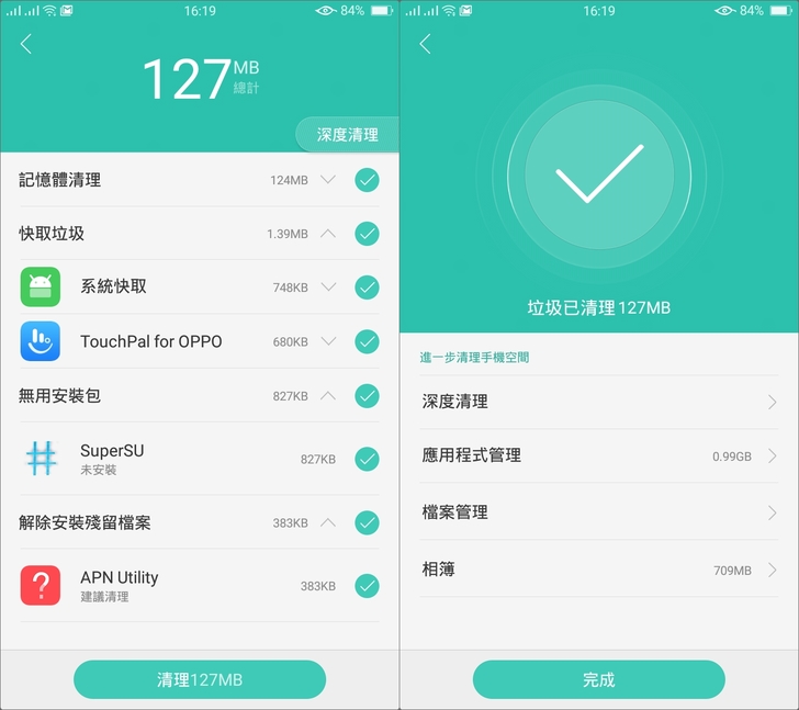 F1s使用全新ColorOS3.0作業系統,這個UI發展至今,感覺還蠻順暢的,小編在體驗的過程中,也沒發生過熱當機的現象,雖然是基於Android 5.1,但小編覺得更人性化,很多貼心的功能讓操作更簡單,尤其手勢體感與0.22秒急速指紋辨識皆能開啟自訂App,不但成功率高,自由度更高!各個主題桌布與螢幕雜誌更是小編的最愛。真要說的話,就是相機與相簿有時會無法清除記憶體所吃的資源。