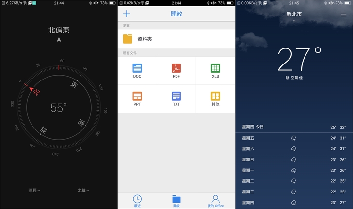 【▼】好用工具集還有爬山必備的指南針、Kingsoft Office能讓你開啟常見文書檔,內建天氣能預報未來一周天氣狀況。