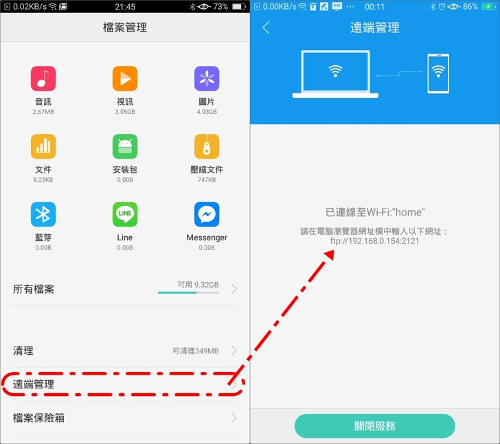 【▼】在檔案管理的部分,除了可以查看目前F1s內各個型態的檔案大小外,還可以遠端管理,在同一個區域網路下,能夠過電腦來管理,以ftp通訊協定進入,port固定為2121。