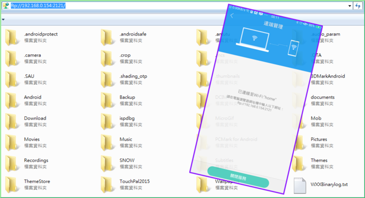 【▼】實際在電腦上連線,果然能登入到手機的檔案總管模式,由於這功能沒設定權限,所以有開啟這功能,大家都能登入到你的手機,建議這功能要用時再開啟即可。