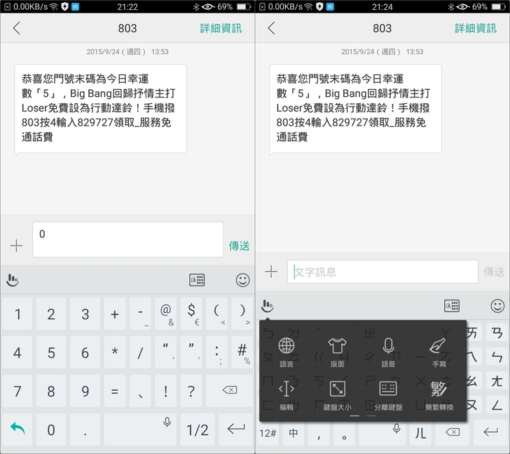 【▼】ColorOS 3.0在輸入方面,除了中英文好切換之外,九宮格數字與常用符號可在同一介面上,並可以調整鍵盤大小、分離鍵盤,這些都是加速打字與減少打錯的好工具。