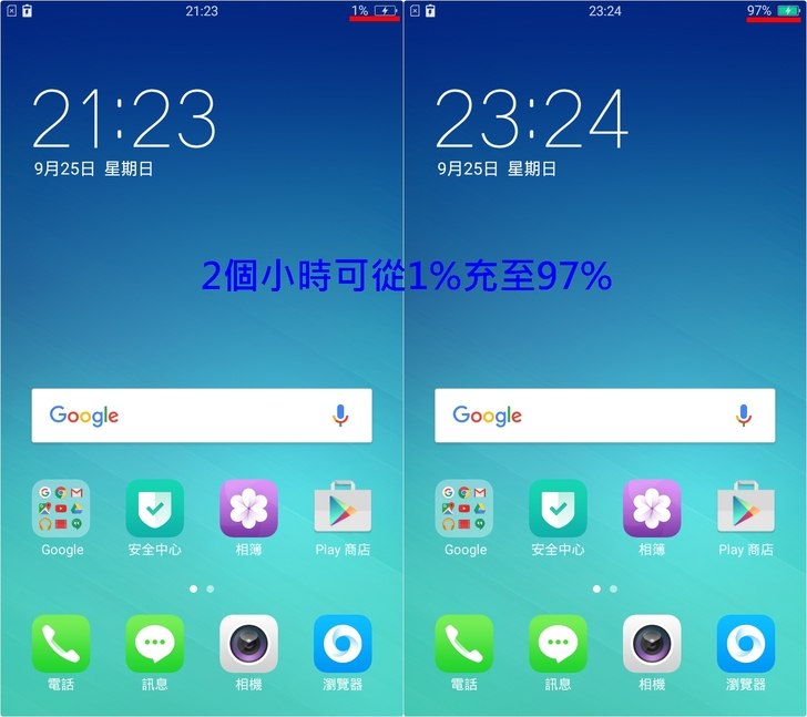 【▼】小編從1%的電力充到97%大約要2個小時,雖然F1s沒有快充,但還可以接受就是了。