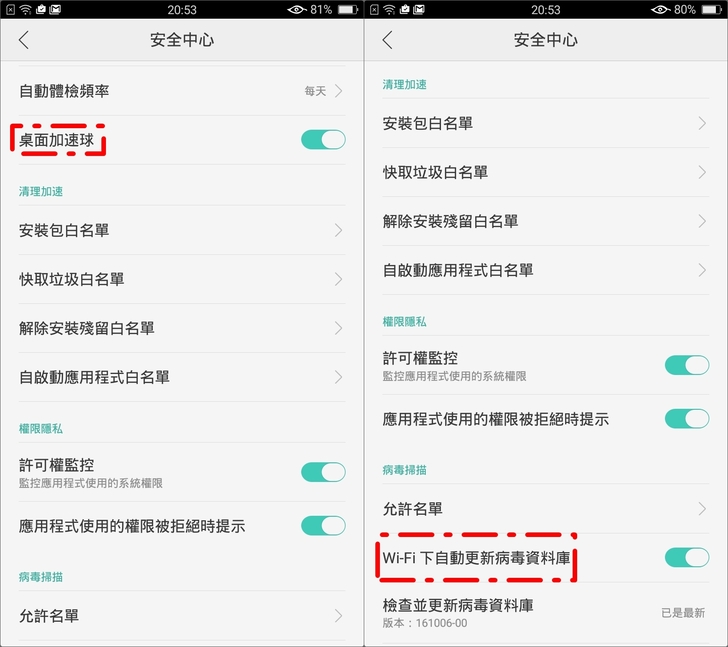 【▼】安全中心的設定中,建議開啟自動體檢頻率為每天、顯示加速球與自動下載病毒資料庫。